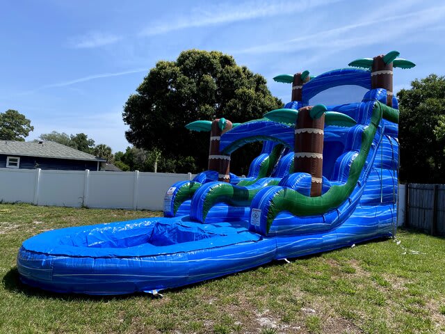 Make a reservation with us today by using our simple online reservation system. If you'd like to speak with us about the 18ft Blue Hurricane Water Slide with Pool or any of our other products, check out our contact page.