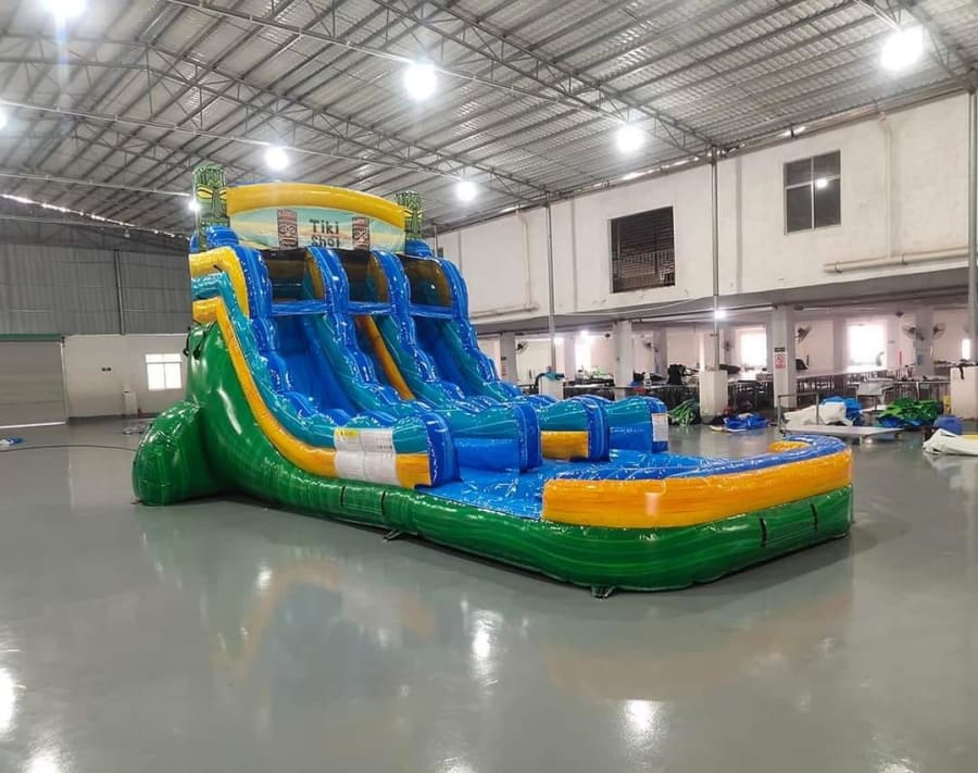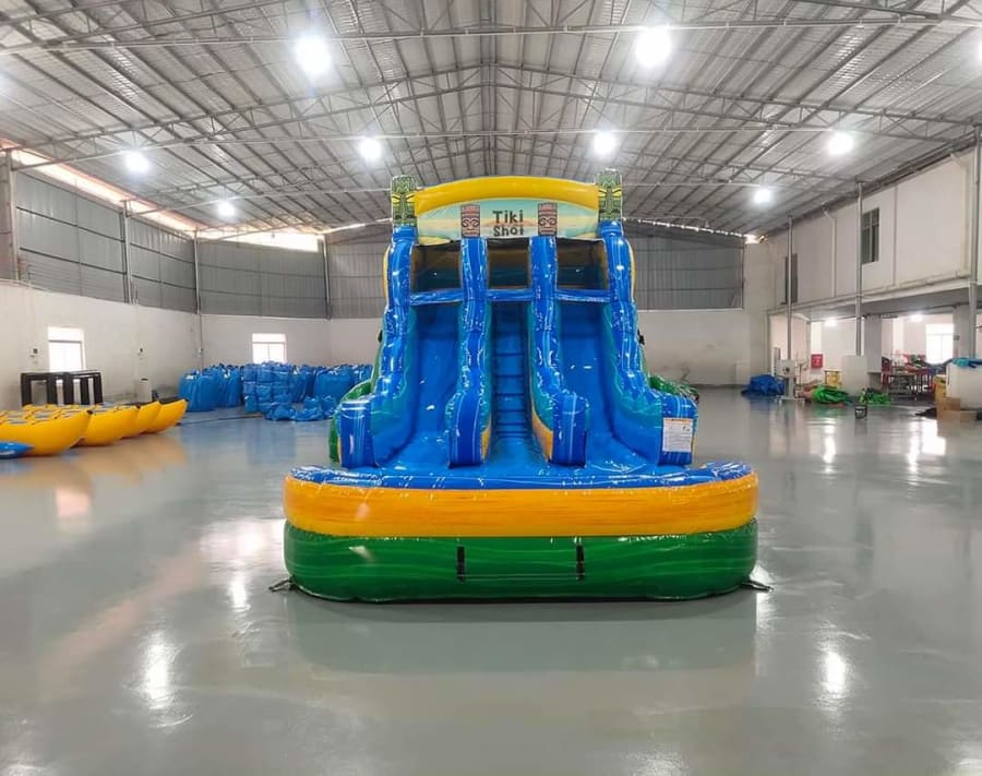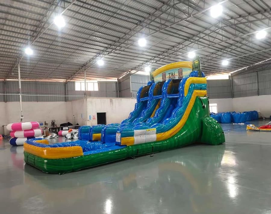 Overall, a 16 foot dual lane tiki slide is a fantastic way to add excitement and entertainment to your summer party or event. Its playful tiki theme, dual lane feature, and refreshing splash pool make it a popular choice for children and adults alike, providing a safe and fun way to cool off and enjoy the summer sun with friends and family.