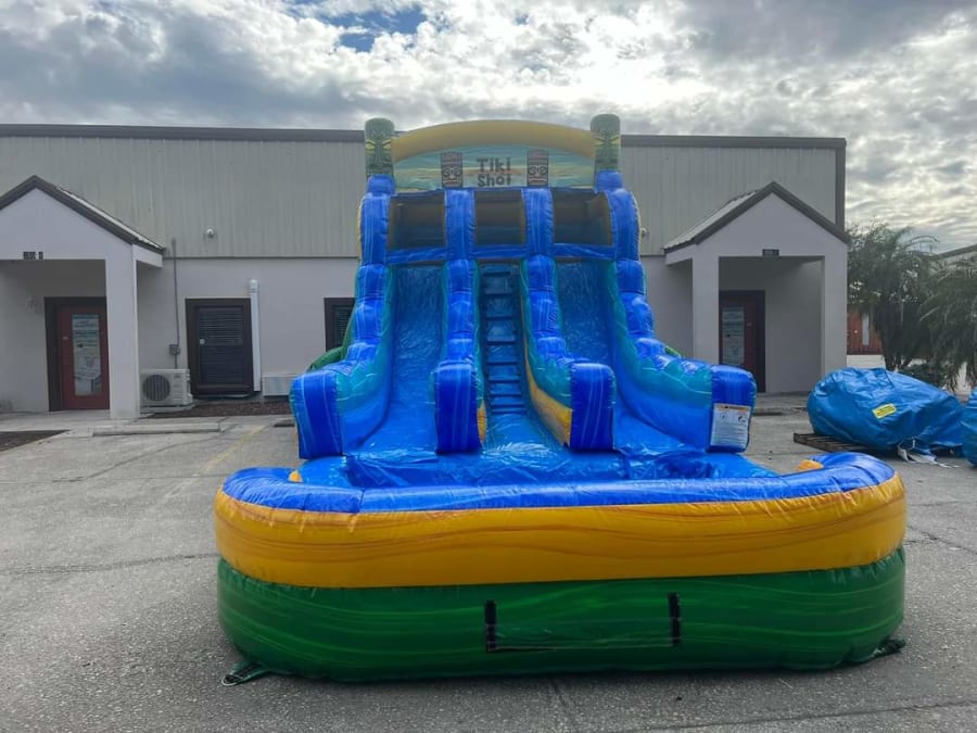 The Brand new in 2023 Dual Lane Tiki Shot water slide is sure to be a hit at any party or event. It's bright yellow and green color scheme is sure to stand out in any crowd.