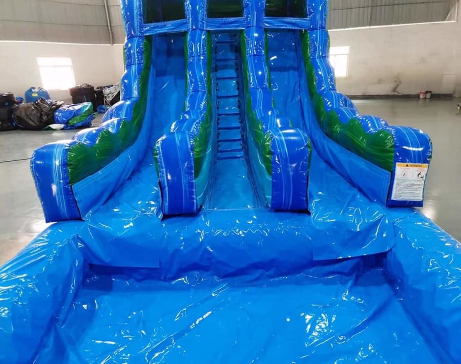 The 16ft Dual Lane Island Drop is a new slide addition for the spring of 2023. This slide has 2 wide slide lanes and easy to climb stairs going up the middle so you don't even have to get out the pool to go back up the stairs. This is a very pretty slide with a teal blue and dark blue color scheme a with marble swirl. This slide was ordered with an extra large pool to ensure a safe landing from both slide lanes. You can reserve this slide right here on our site, call us at (337)806-7504, or by visiting our Contact Us page.